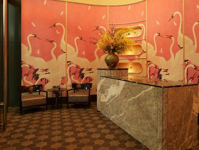 The restaurant'southward interiors ready the phase for the dining feel. Departing from the classical discreet design of traditional Japanese fine-dining establishments, the walls are draped in a soft pink Gucci wallpaper depicting dancing cranes. Room dividers mimic undulating mount landscapes, while a cascading moving ridge of washi paper sheets is suspended from the high ceiling, emulating clouds.